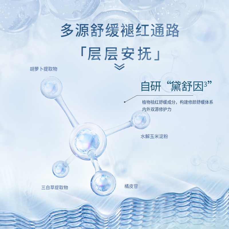 *3指品牌自研专利成分 “黛舒因”(专利申请中,发明专利申请号:CN202510916241.9),含水解玉米淀粉、三白草提取物、胡萝卜根提取物、水溶性橘皮苷,一种植物来源多维舒缓修红组合物。可多维度舒缓修护皮肤、长效修护皮肤屏障、提升皮肤耐受性,且安全性与稳定性佳,适用于各类肤质,尤其敏感肌。